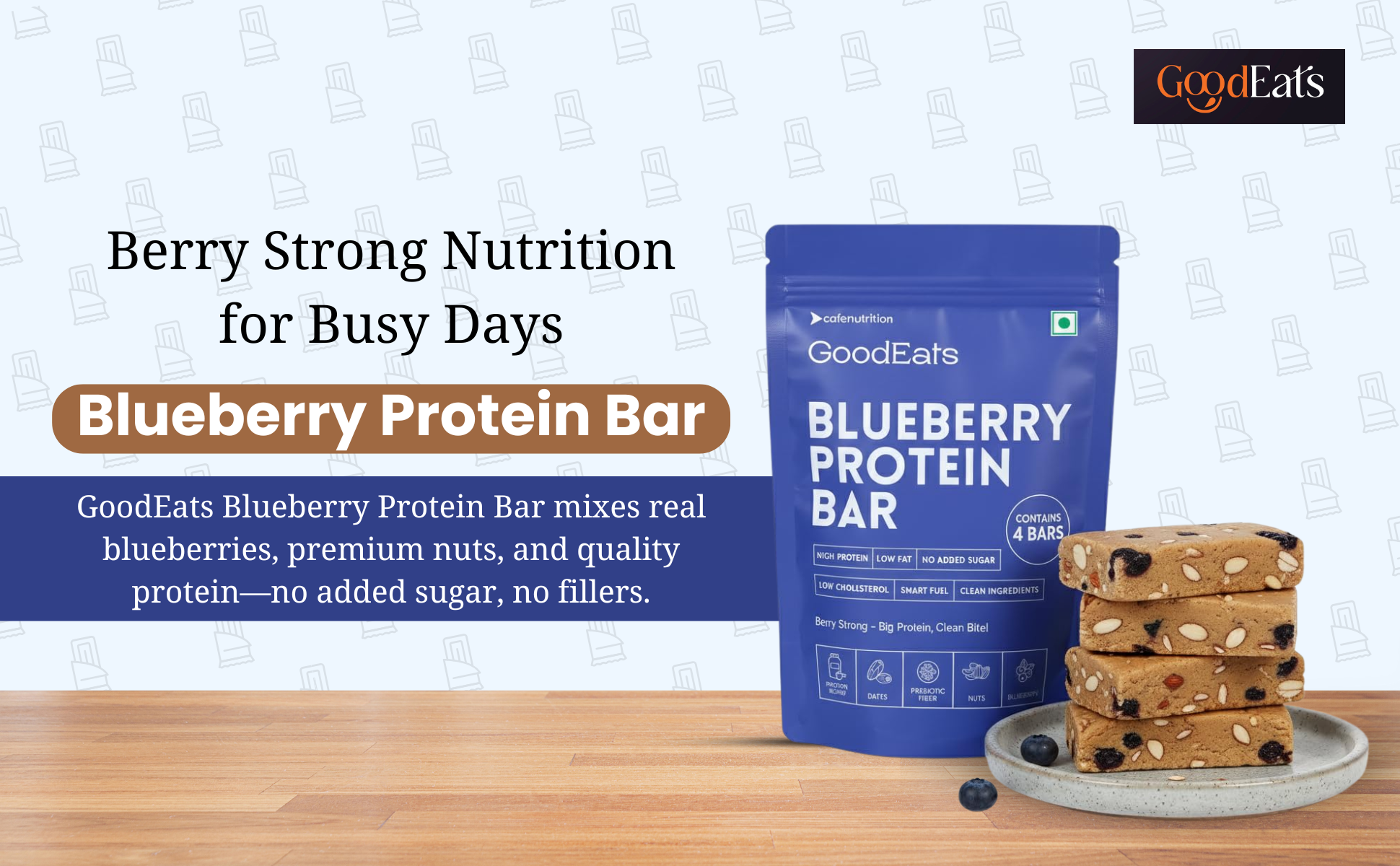 A fruity twist on protein snacking juicy blueberries blended with dates, oats, and whey isolate. High in protein, high in fiber, and naturally flavoured for a refreshing, wholesome bite.